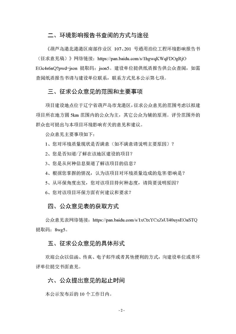 葫蘆島港北港港區(qū)南部作業(yè)區(qū) 107、201 號(hào)通用泊位工程 環(huán)境影響評(píng)價(jià)第二次公示